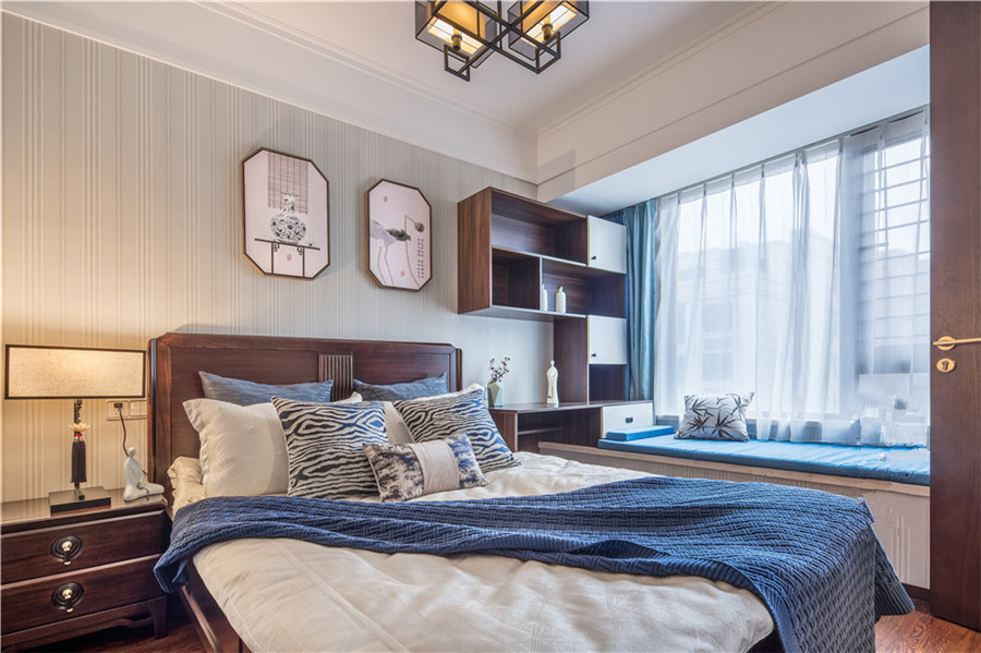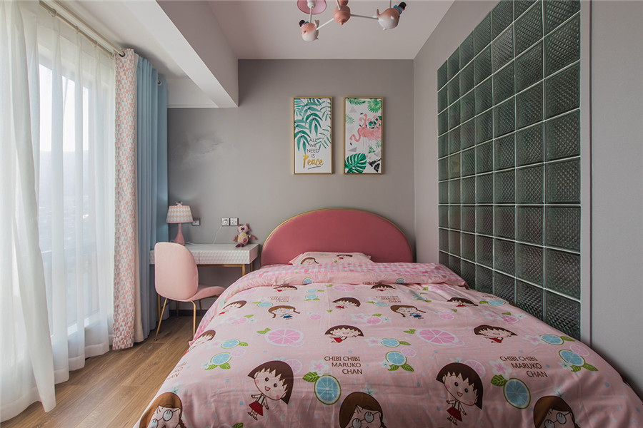 新中式風(fēng)格重要的是中式元素的合理運(yùn)用,在整體的家居氛圍里注入中式的典雅與禪意。設(shè)計(jì)師在設(shè)計(jì)女兒房的時(shí)候,流行元素用得比較多,充分尊重了業(yè)主的喜好與需求。