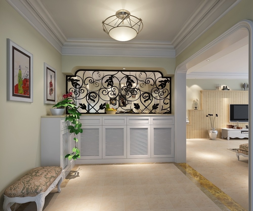 玄關(guān)和餐廳之間用設(shè)計獨到的鏤空屏風(fēng)隔開來,既可以裝飾玄關(guān)與餐廳,又能讓玄關(guān)的光線透到餐廳,明亮又通透。