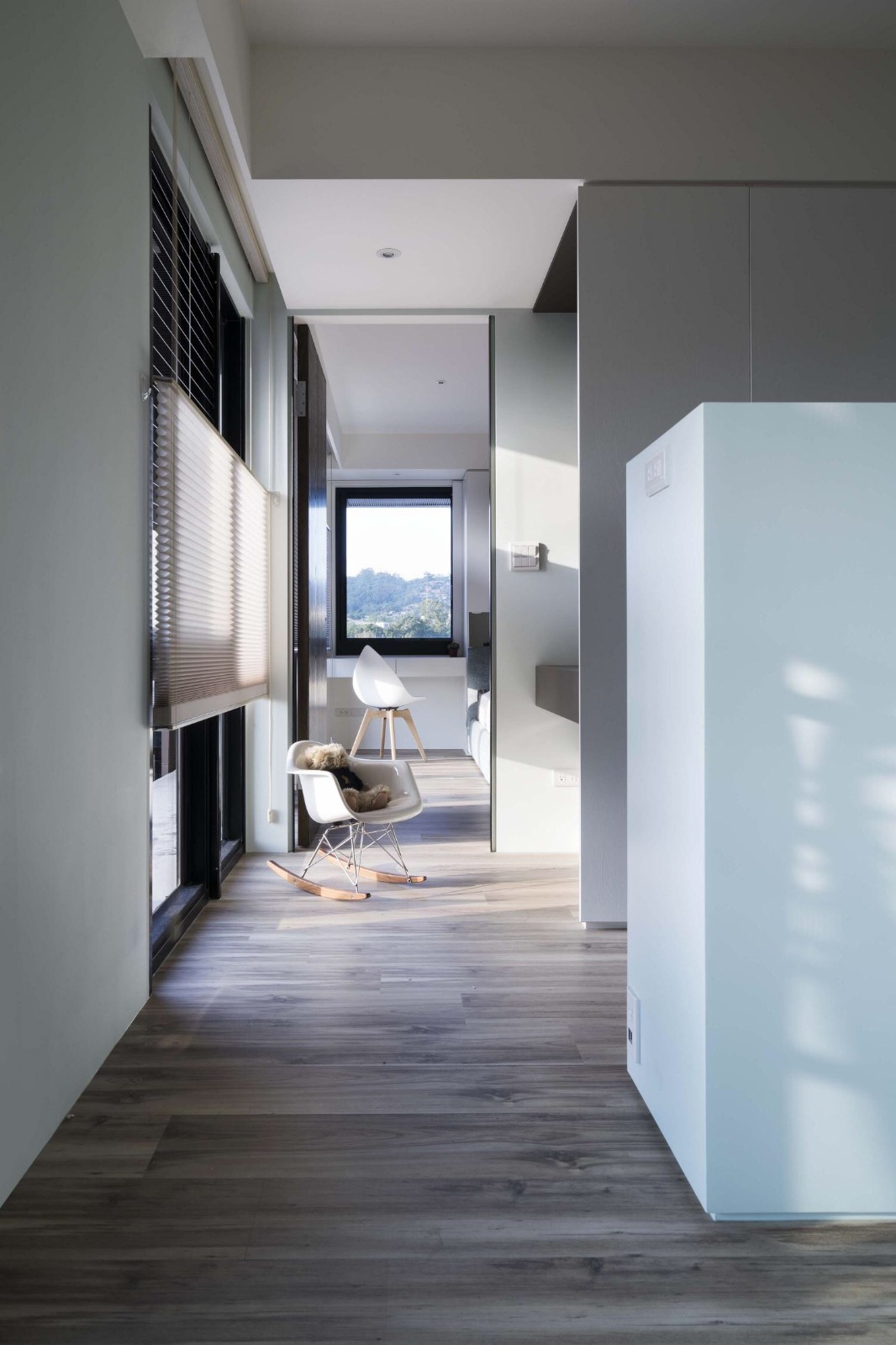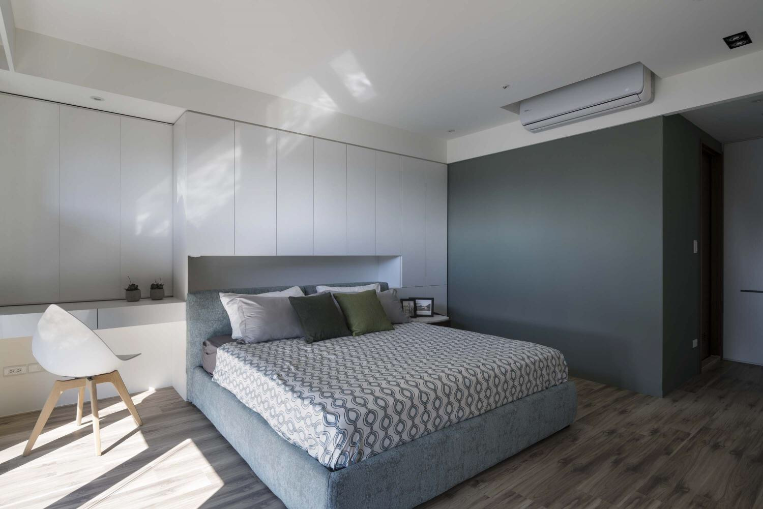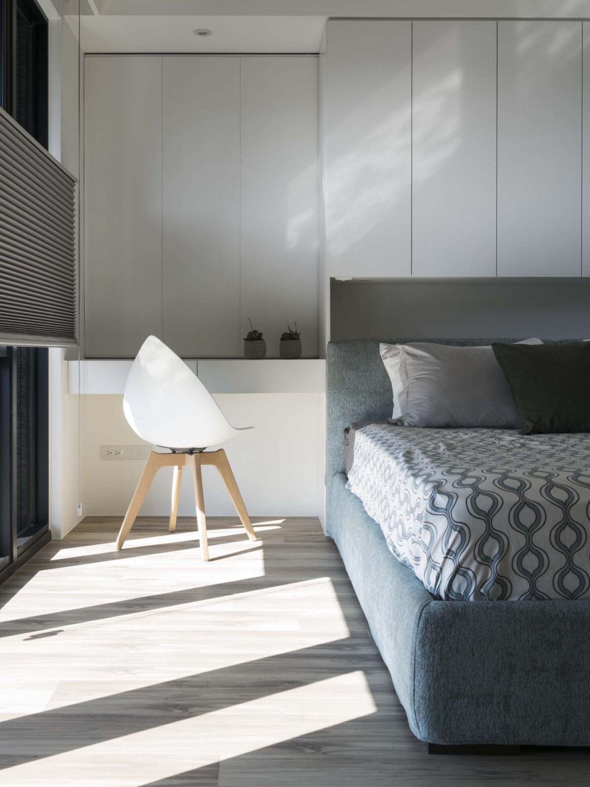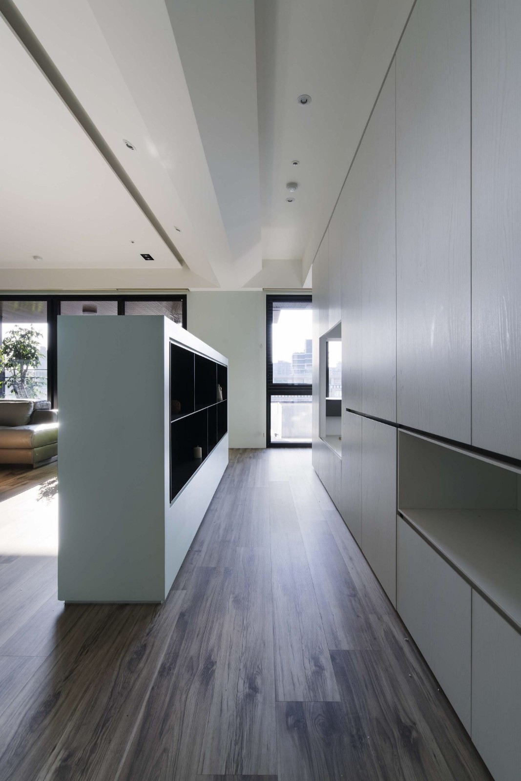 這套房子以黑白灰為主色調(diào),但是某幾處墻面用了帶點灰調(diào)的淺藍色作為裝點,簡單的同時也不缺乏設(shè)計感。房屋里的柜子幾乎都是定制的,它們滿滿當(dāng)當(dāng)?shù)卣紦?jù)了一整面墻,跟整體風(fēng)格的適配性相當(dāng)?shù)貜?,也不會占用過多的面積,真正做到了美觀又實用。