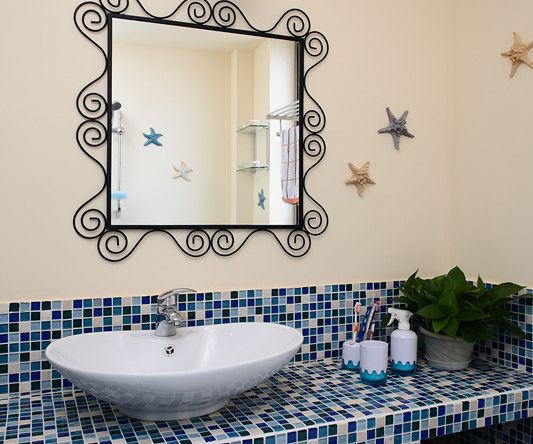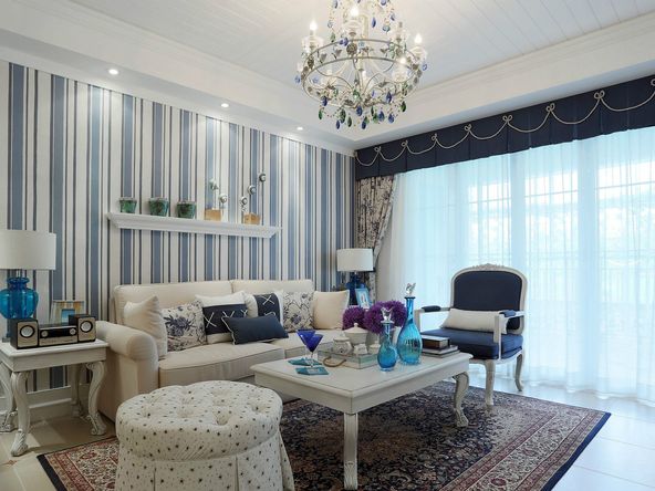 藍(lán)色是地中海風(fēng)格里最不可缺少的元素,客廳沙發(fā)背景墻用的是藍(lán)白條紋,廚房是水藍(lán)色的瓷磚搭配以純白色的櫥柜,衛(wèi)生間用的是馬賽克的瓷磚來鋪設(shè)盥洗臺(tái),選用的瓷磚依舊是以藍(lán)色為主。藍(lán)色會(huì)給人一種放松的舒適感,整體的氛圍也沒有那么嚴(yán)肅,有一種活潑與輕快。