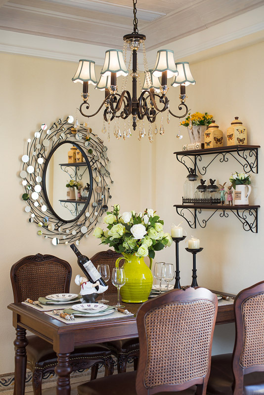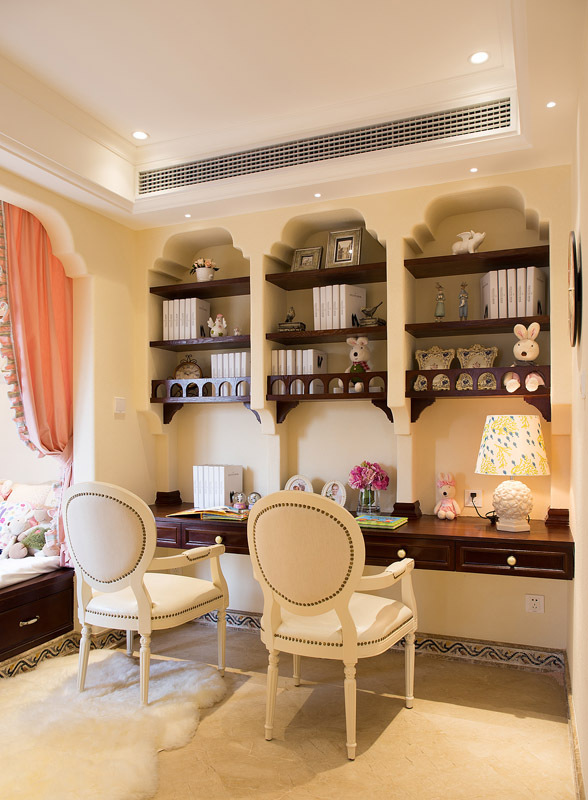 這一套田園風(fēng)格沒(méi)有運(yùn)用太過(guò)花哨的裝飾,整體上有點(diǎn)向簡(jiǎn)約風(fēng)靠攏,但是也很有田園風(fēng)的特色:悠閑、舒暢、自然。書(shū)房的裝修也很有特色,用壁龕的設(shè)計(jì)代替櫥柜,長(zhǎng)長(zhǎng)的書(shū)桌滿足兩個(gè)人同時(shí)使用的需求,飄窗上簡(jiǎn)單地布置了一下,成了一個(gè)舒適的休閑空間。