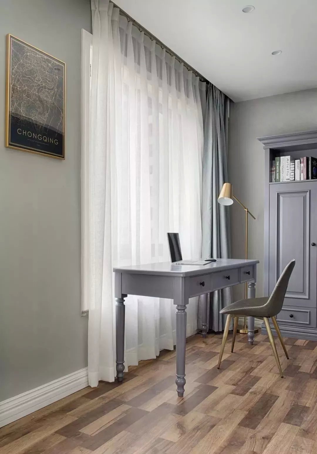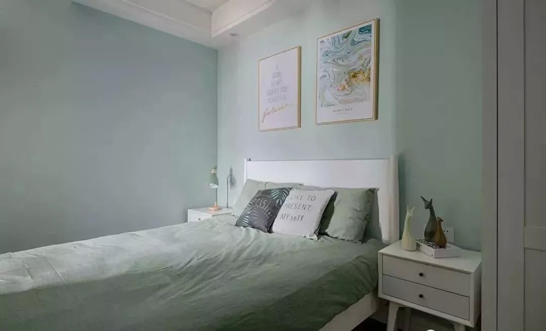 黑白灰是最北歐風(fēng)里最常見的主色調(diào),但是為了讓臥室的色調(diào)不會太過沉悶與單調(diào),所以偶爾會用一些比較清新的顏色,作為臥室的主色調(diào)或者裝飾。這套二居室的次臥就是如此,稍微帶點(diǎn)灰調(diào)的綠色,清新自然,有一種怡然自得的舒適感,每一幅裝飾畫都是精心挑選出來的,符合整體的家居風(fēng)格。
