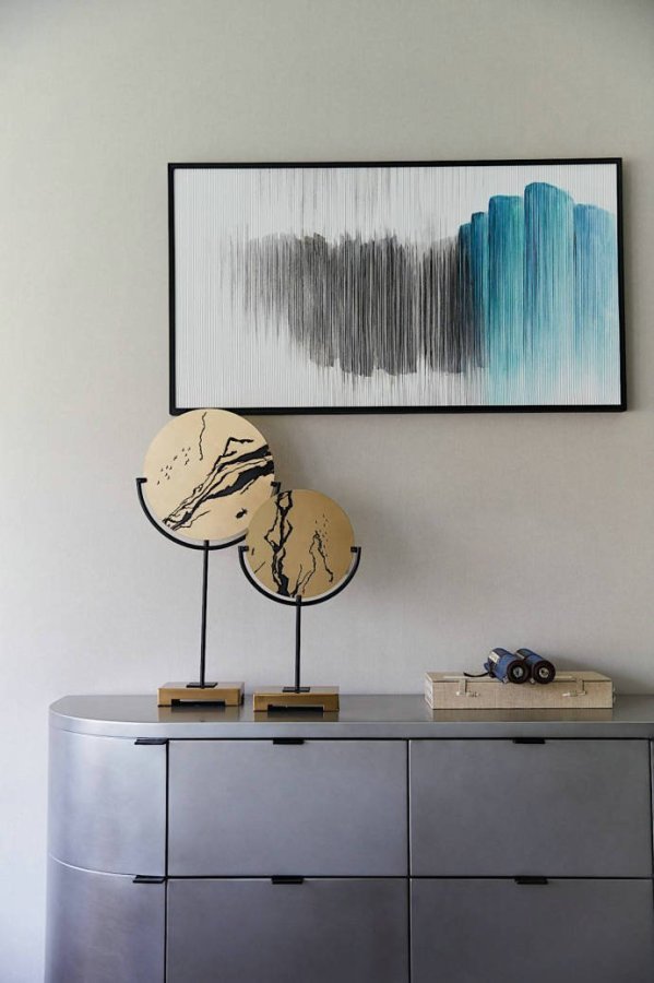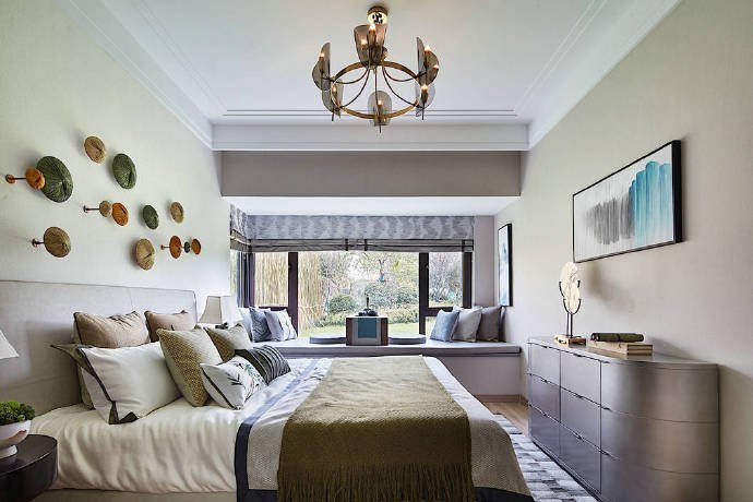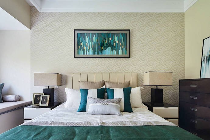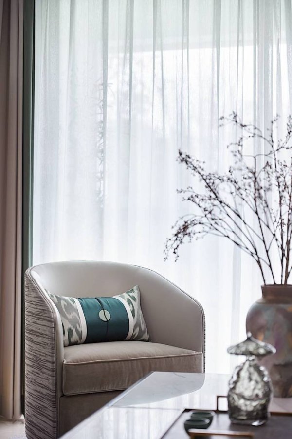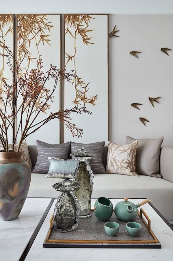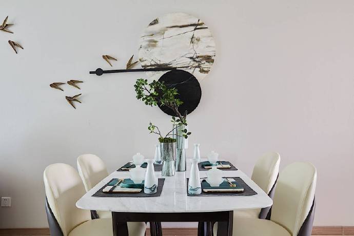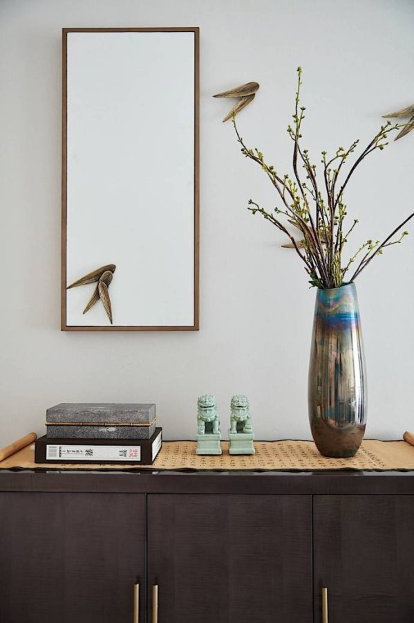 竹子、飛鳥、臘梅,這些元素一結(jié)合在一起,你就能很明顯地看出業(yè)主的喜好。業(yè)主喜歡中國(guó)傳統(tǒng)文化,也喜歡中式風(fēng)格的裝修,但是也要考慮家里妻子和孩子的喜好,所以就有了這樣一套簡(jiǎn)單時(shí)尚、禪意十足的新中式裝修。如果只用黑白水墨打造中國(guó)風(fēng),未免太單調(diào),所以設(shè)計(jì)師加入了一點(diǎn)孔雀藍(lán)的色彩,質(zhì)感十足。