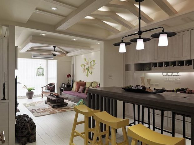 這套東南亞風格的二居室,沒有像之前常見的東南亞風格一樣,大面積使用棕色做裝飾,反而是以白色為主,適當點綴一些民族特色十足的裝飾,因此整體的氛圍比較清新,不會顯得雜亂。設計師往客廳增添了不少綠植,跟背景墻上的花樣相呼應,賞心悅目,沁人心脾。