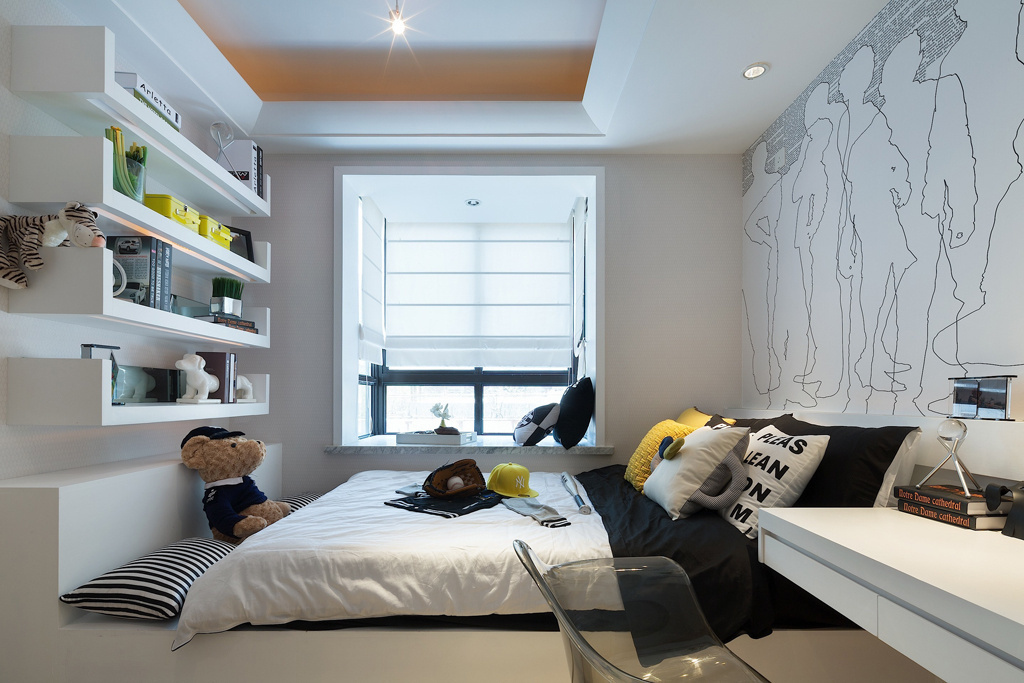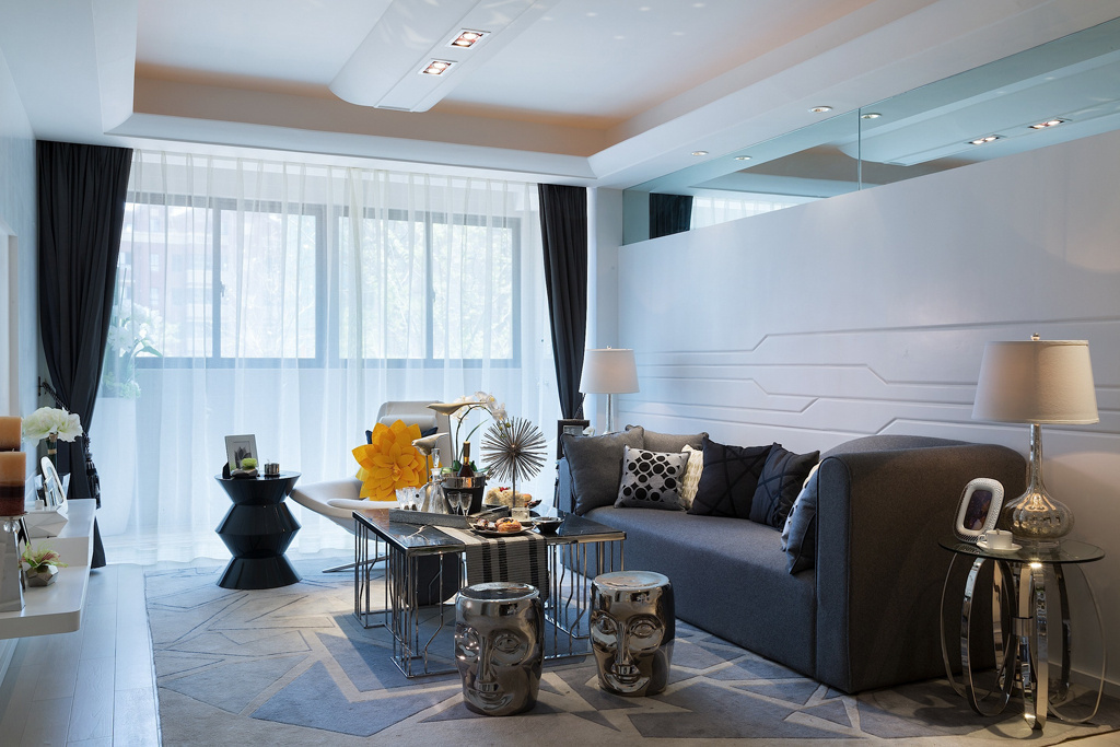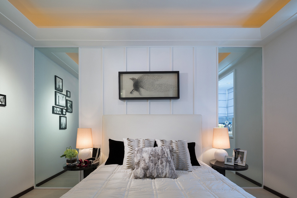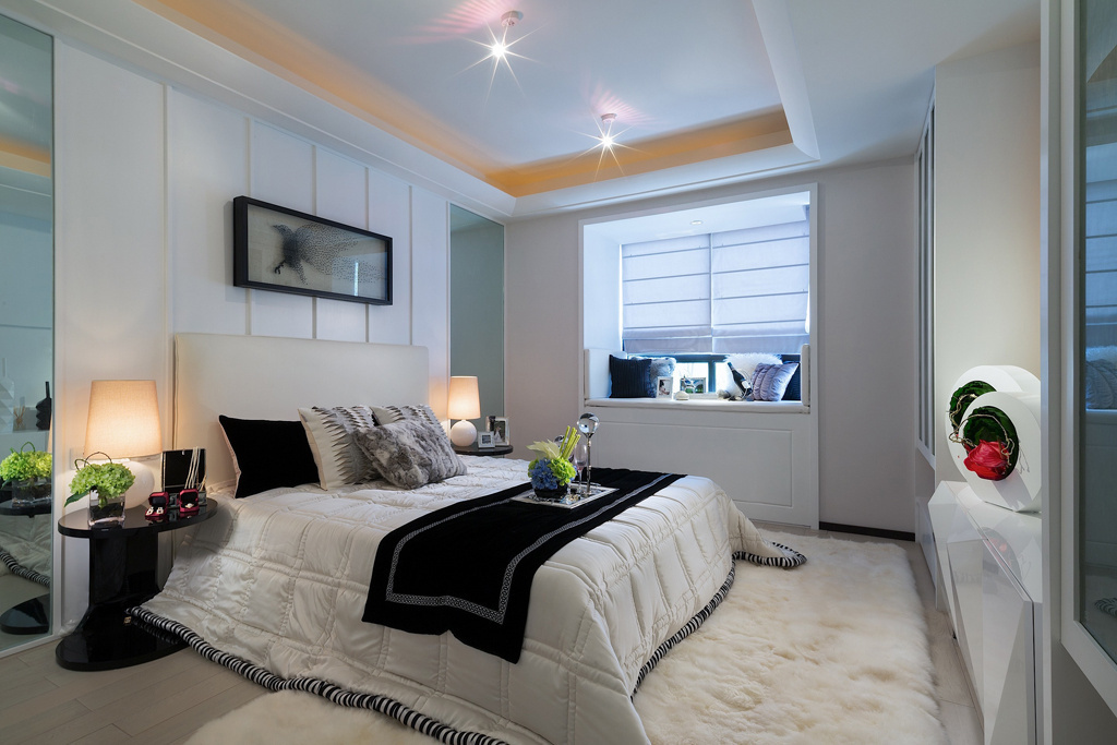 這套后現(xiàn)代風(fēng)格充滿設(shè)計(jì)感,細(xì)節(jié)上有一些叛逆,就像客廳里的小矮凳,并不是所有人都能接受的款式。臥室的風(fēng)格相對(duì)比較簡(jiǎn)潔,以白色為主色調(diào),用鏡子和玻璃增加層次感,效果十分不一樣。