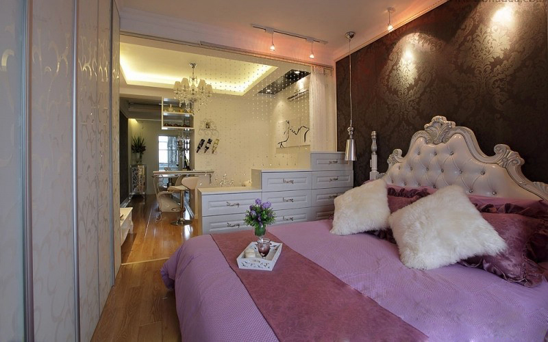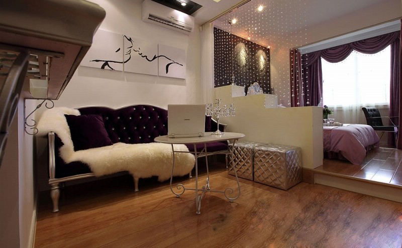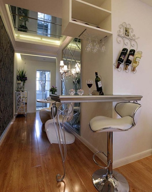 在歐式風格的加持下,就算是小戶型,也做出了華麗、大氣的感覺。臥室和客廳之間用一個階梯狀的儲物柜做隔斷,既實用又美觀。即使客廳的空間并不算寬裕,但是沙發(fā)和吧臺一應俱全,一個人也可以過得精致又舒適。
