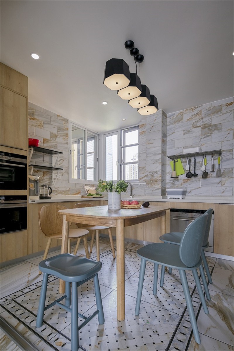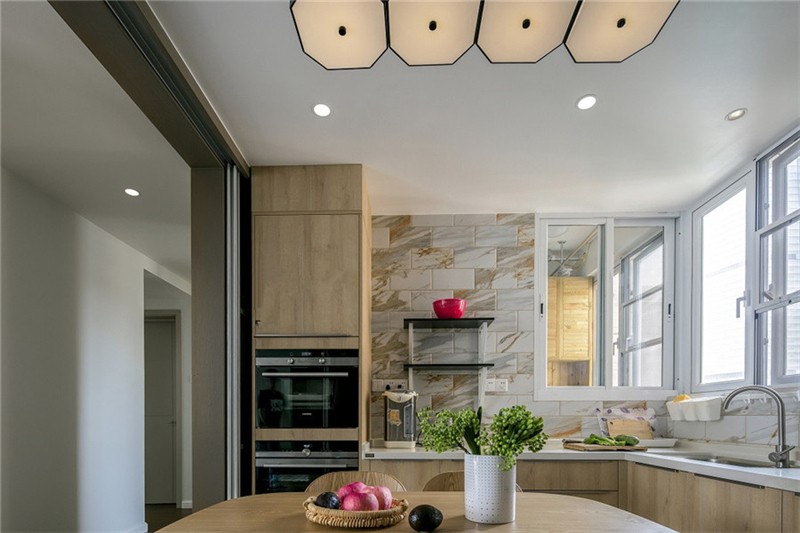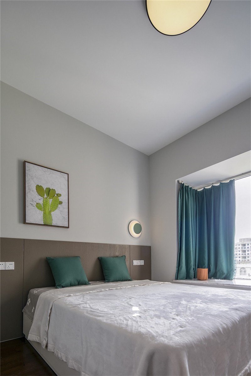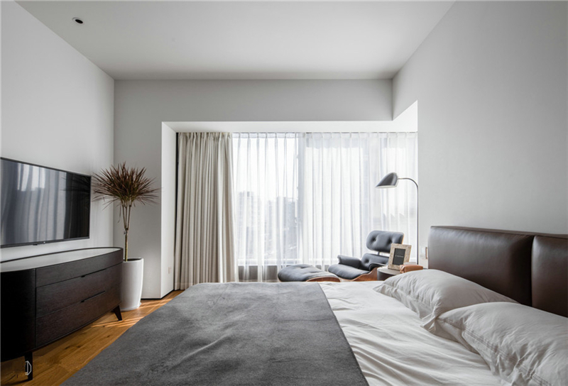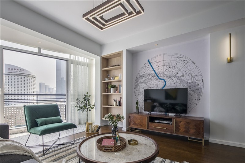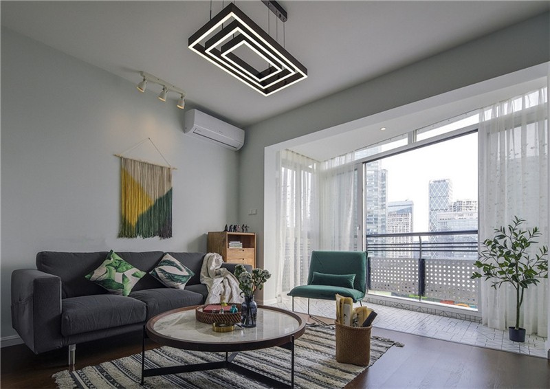 業(yè)主夫妻追求簡潔與時尚的裝修,設(shè)計師用白色、灰色和木色作為客廳的主色調(diào),客廳和陽臺之間也沒有設(shè)置隔斷,所以光線能夠輕而易舉地照進客廳,整個客廳看起來十分的寬敞、明亮,適當?shù)木G植讓人看起來心曠神怡,一天的疲勞都消除了。