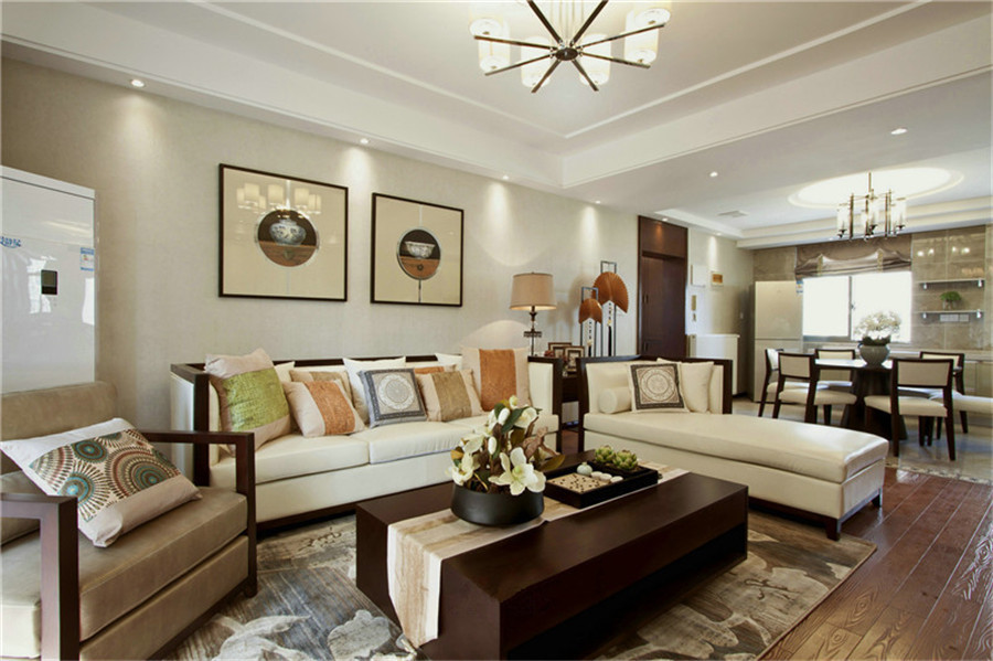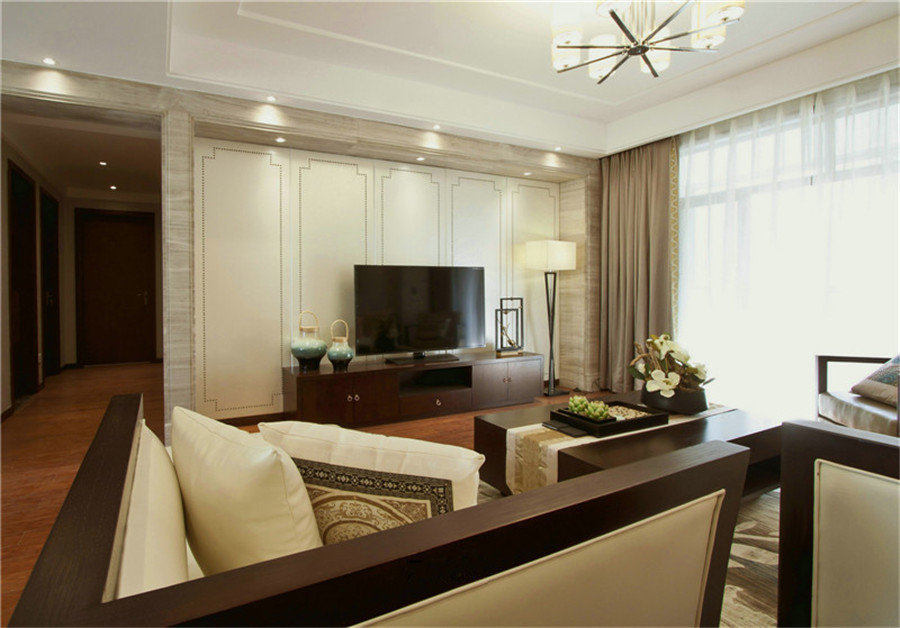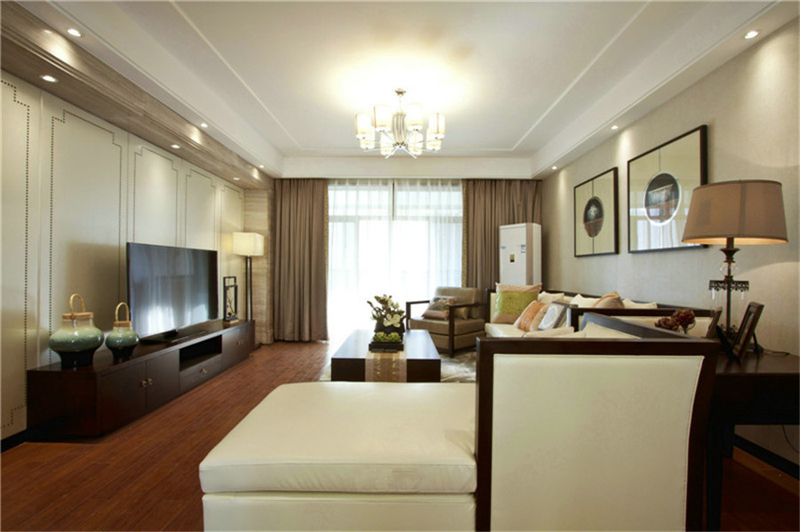業(yè)主喜歡中式風(fēng)格的裝修,但是他覺得傳統(tǒng)的中式家具太過古板,所以希望能夠融入一點現(xiàn)代化的元素,于是就有了這樣一套新中式風(fēng)格的三居室??蛷d使用的是布藝沙發(fā),搭配上木質(zhì)腳架,一臺簡單小巧的茶幾就能彰顯出中式風(fēng)特有的復(fù)古韻味。