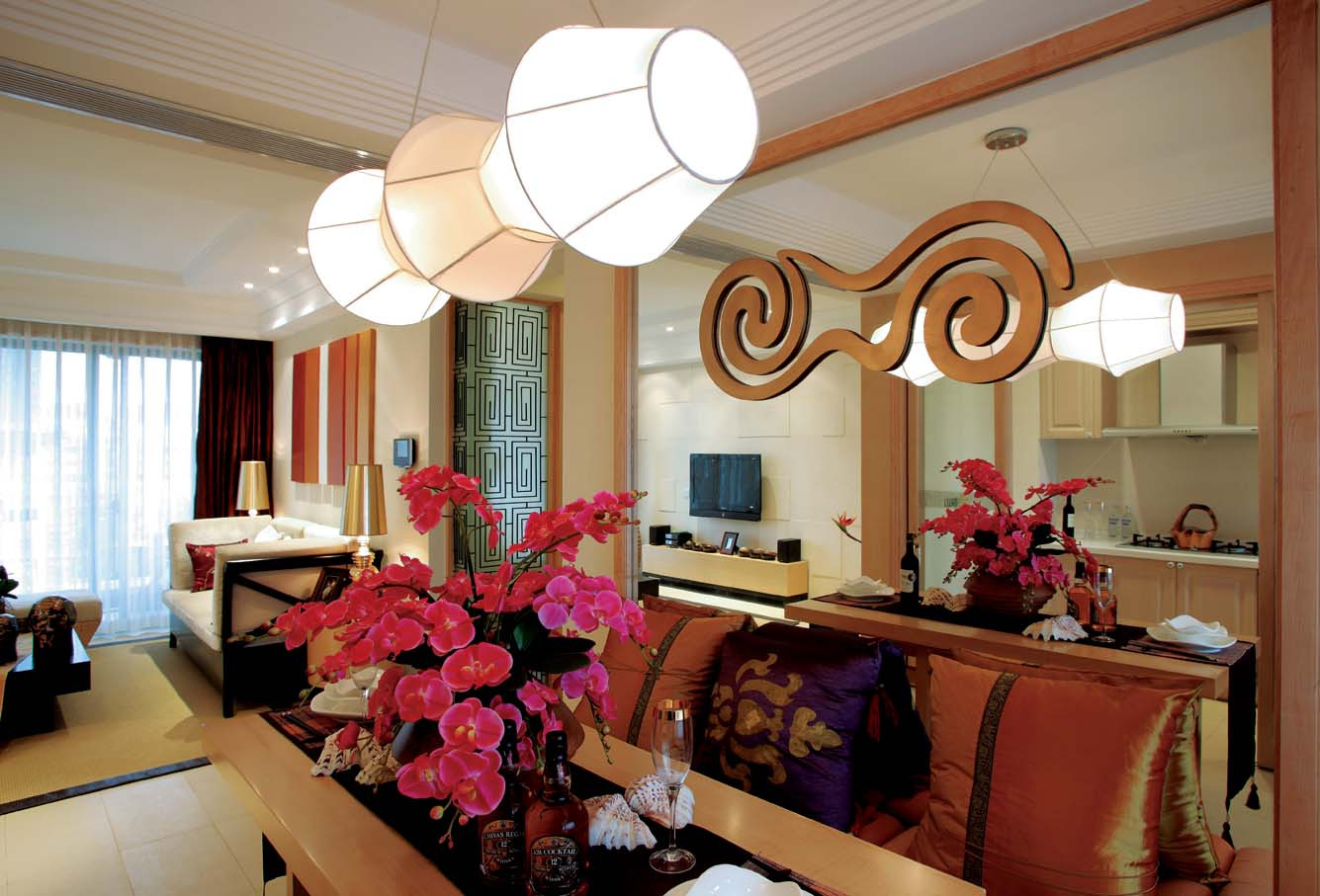 東南亞風(fēng)格兼具靜謐與雅致、奔放與脫俗的特色,適合喜歡民族特色與異域風(fēng)情的業(yè)主。這一套東南亞風(fēng)格處處可見別出心裁的小設(shè)計(jì),就比如餐廳背景墻上的祥云紋,就體現(xiàn)著一種禪意與厚重。
