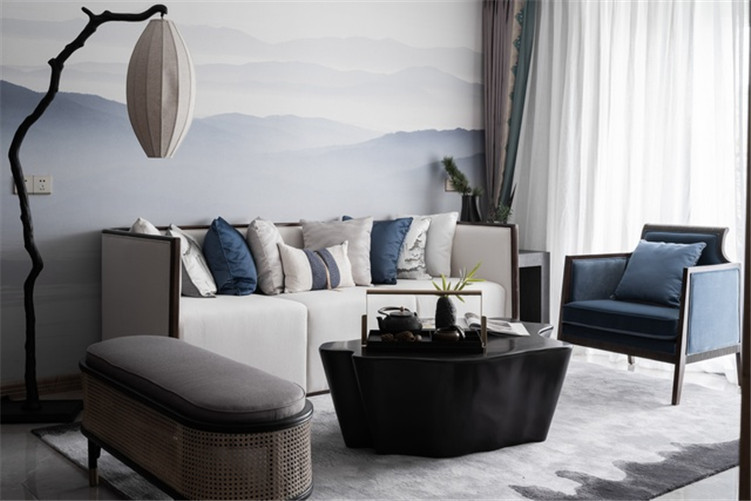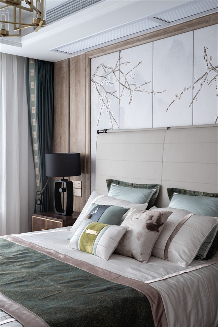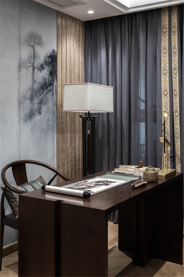 設(shè)計師在臥室背景墻、客廳背景墻和書房背景墻上,下了很多功夫??蛷d的背景墻是一片遠(yuǎn)山,意境更深,有一種層次感。書房的背景墻則是柏樹,象征堅強(qiáng)、高尚。而臥室的背景墻則是臘梅,凌寒獨(dú)自開,象征君子氣節(jié),業(yè)主很喜歡這些背景墻的立意。