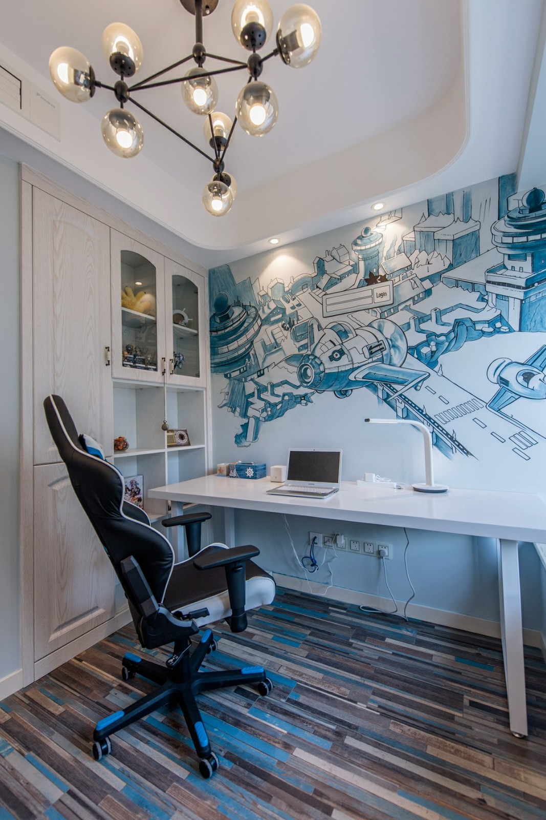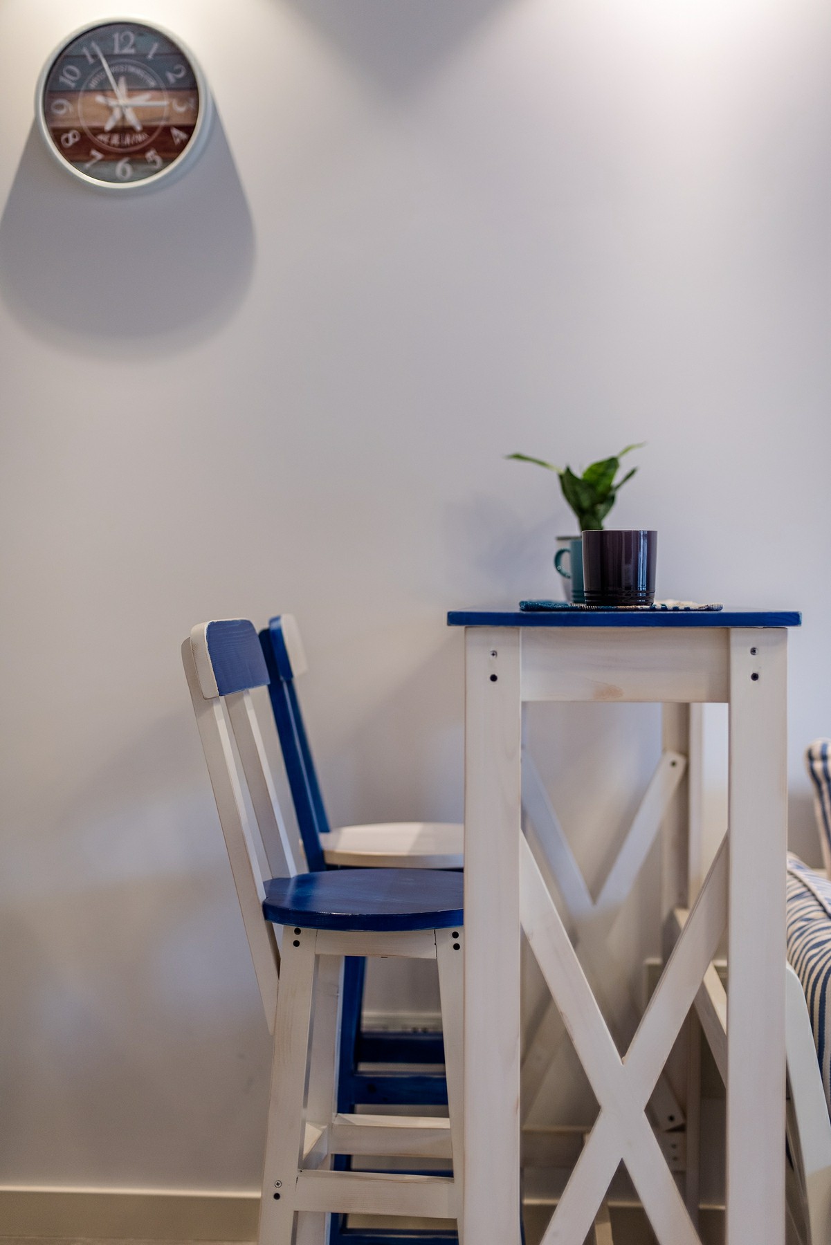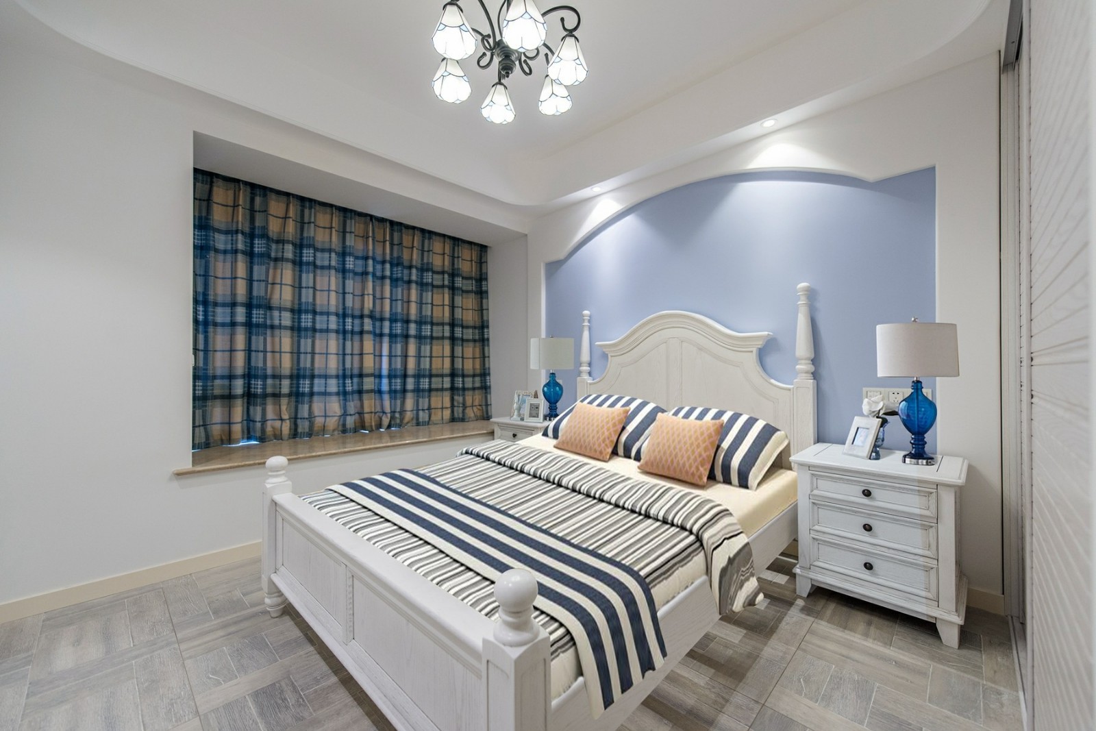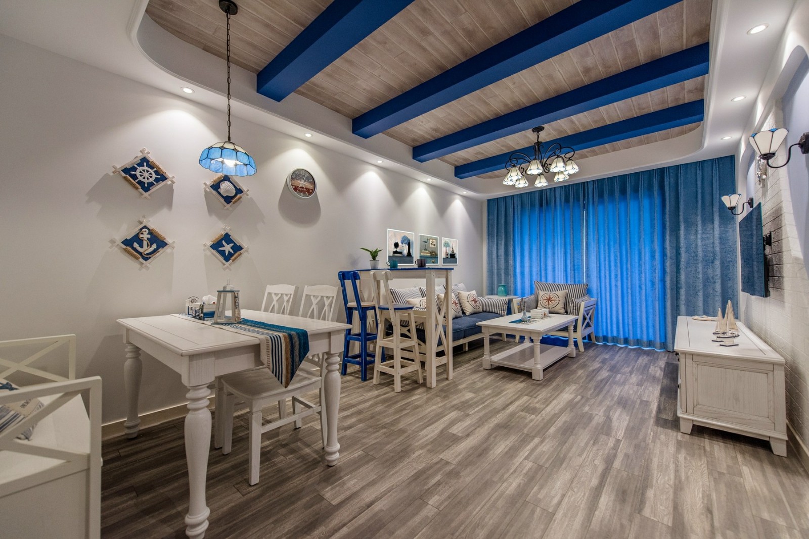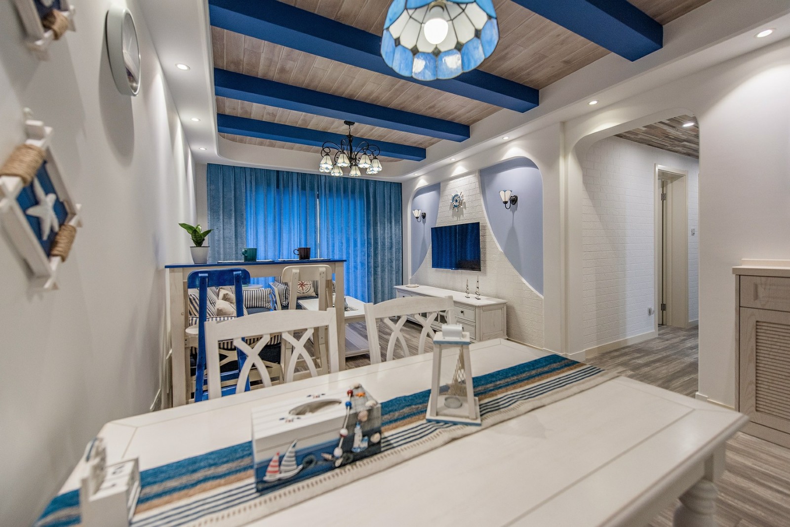 這一套地中海風格的色調(diào)比較冷靜,每一處裝飾都恰到好處。精心選擇的氛圍燈,打造了一種浪漫的意境,整體是清爽的海洋風,很是舒適大氣。天花板的造型很是別致,木紋飾的吊頂搭配上藍色的橫條,簡潔又具備著極強的設計感。