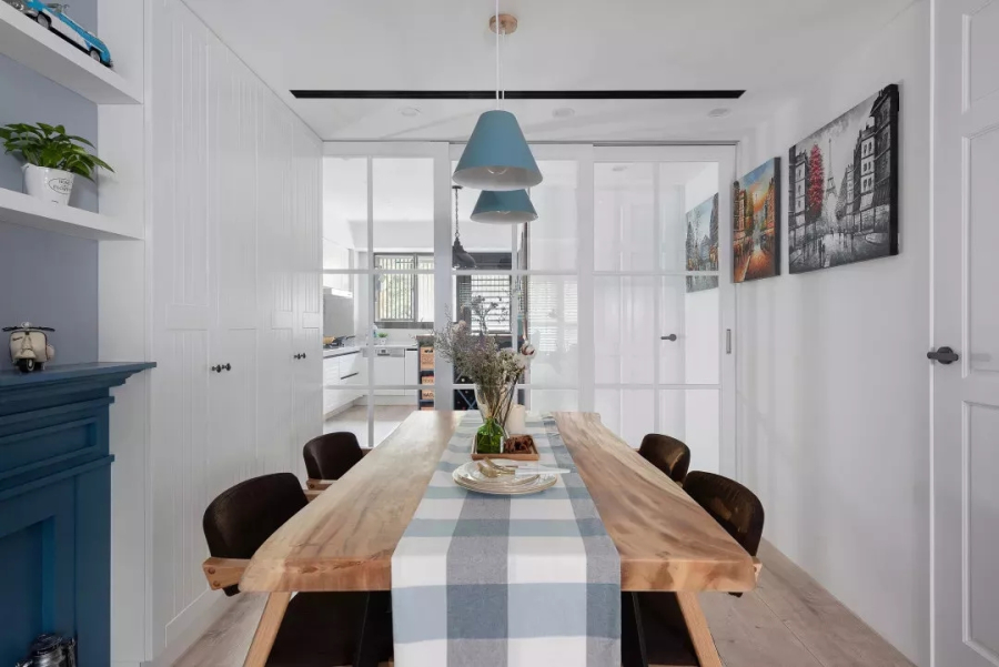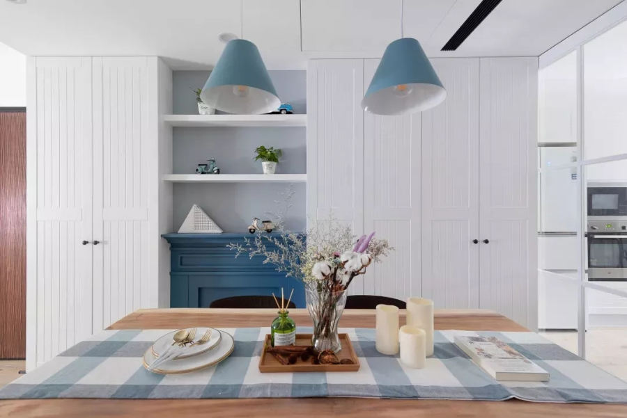 整套北歐風運用了藍色的漸變色來裝點不同空間,同時在空間上做了以下改造:1、在玄關(guān)、餐廚區(qū)及主臥做了多處收納設(shè)置,實現(xiàn)一家三口的收納需求。2、拆掉更衣室,衣柜后退,擴大主臥的空間。