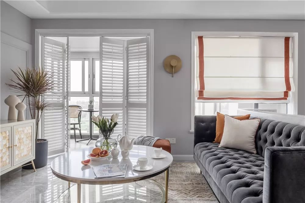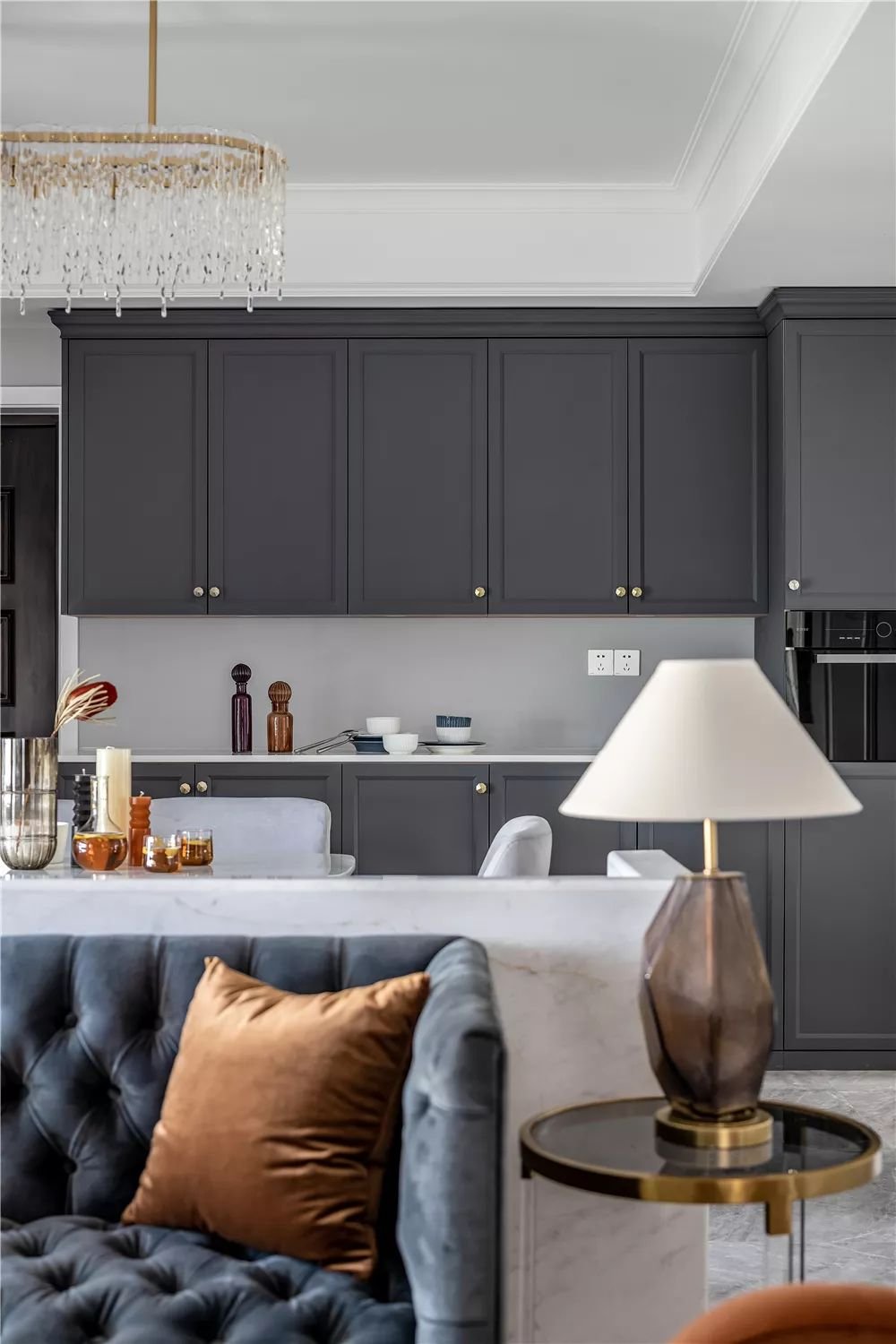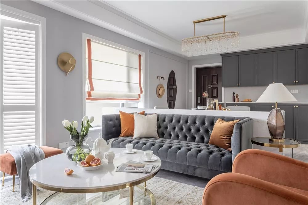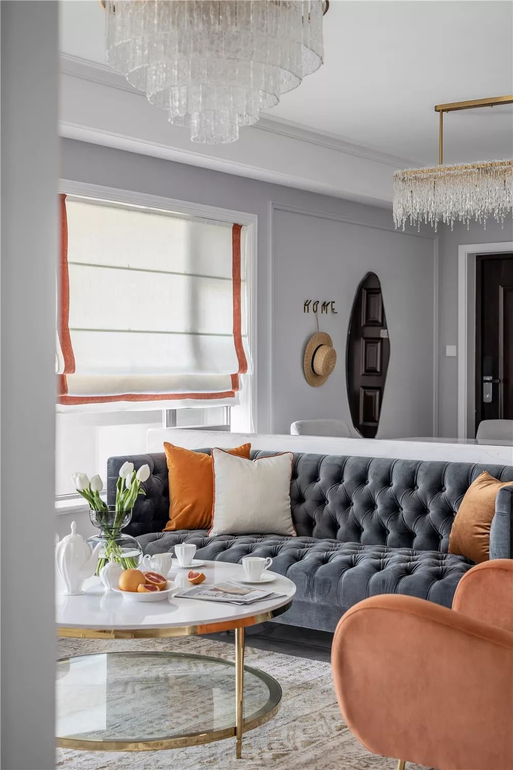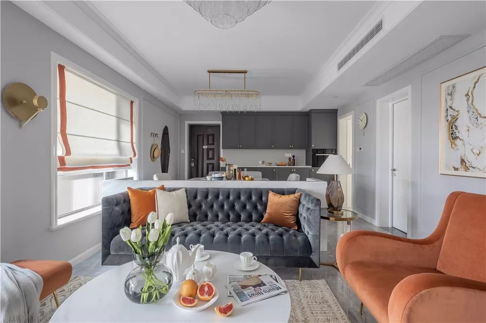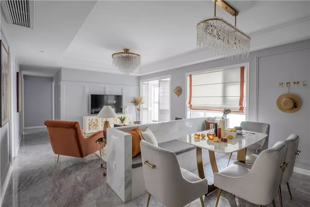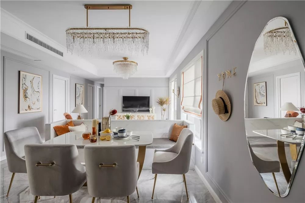 這是一套法式輕奢風(fēng)格的三居室,古典優(yōu)雅,質(zhì)感十足??蛷d、餐廳和玄關(guān)同屬一個空間,所以風(fēng)格設(shè)計上要保證它的一致性。亮色的單人沙發(fā)和抱枕可以提亮整個空間,優(yōu)雅又不失活潑。