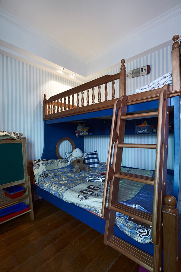 美式的復(fù)古感在這套三居室中展現(xiàn)得一覽無遺,貴氣、隨意又自由的氛圍,讓美式風(fēng)格備受中國業(yè)主的歡迎。兒童房這邊用的是高低床,平時上床很少使用,后期可以用來放置一些雜物。