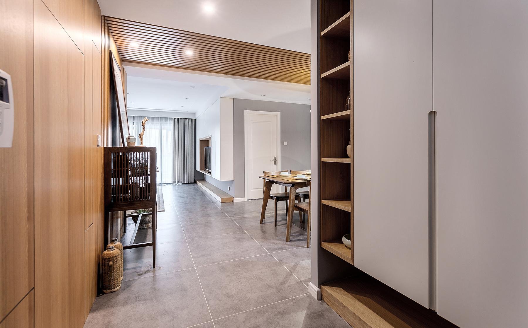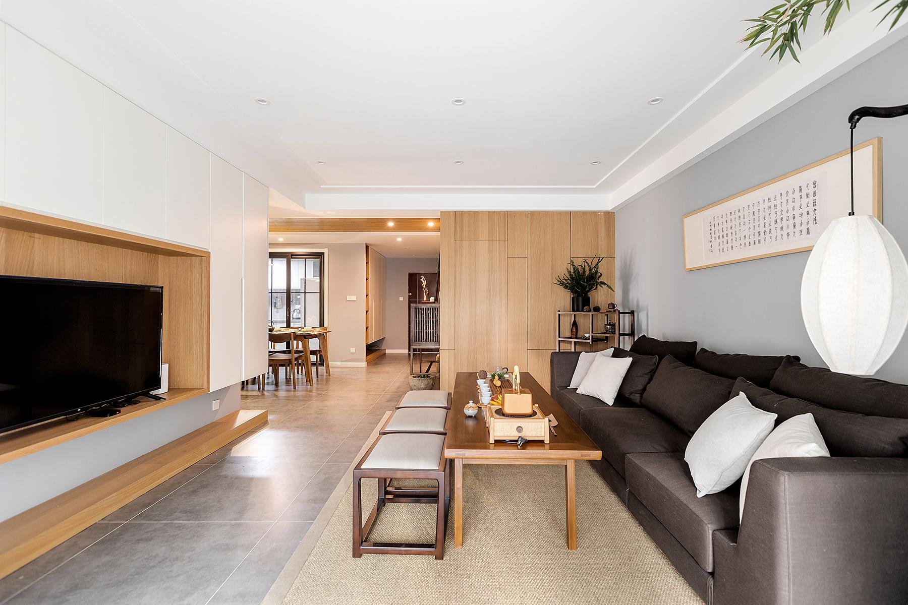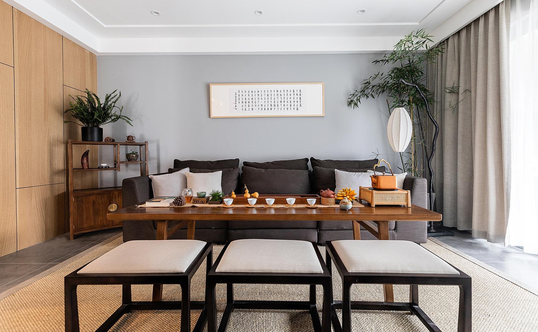 這套新中式風(fēng)格簡潔實用,同時也有一種中式專屬的高雅在里面。不管是玄關(guān)還是客廳,滿滿都是收納空間,不愁沒有地方對方物件。業(yè)主平時會叫上三兩好友來家里喝茶,設(shè)計師摒棄了傳統(tǒng)茶幾設(shè)計,用可以靈活移動的小凳子代替,方便快捷。