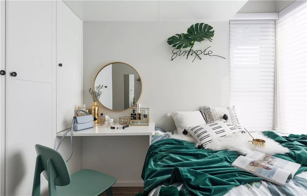 這是一套很經(jīng)典的輕奢北歐風(fēng)設(shè)計(jì),金屬設(shè)計(jì)點(diǎn)綴著整個(gè)空間,提升整體的質(zhì)感。綠色可以打造一種清新自然的感覺,時(shí)尚又大氣。次臥的空間較為緊湊,所以用的是榻榻米加組合柜的設(shè)計(jì),簡單一面梳妝臺(tái)就能打造一個(gè)實(shí)用性極強(qiáng)的空間。