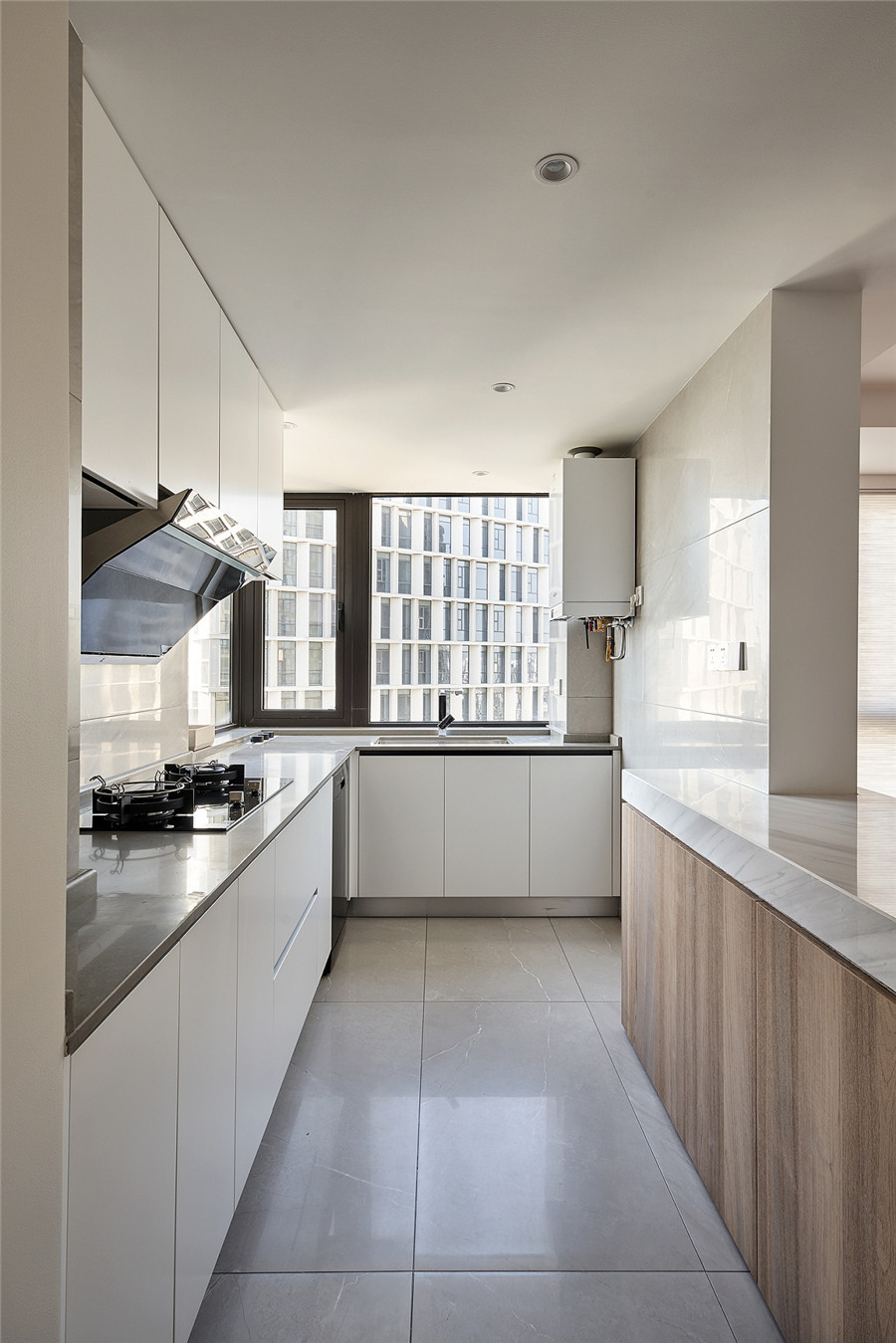 因?yàn)榭蛷d的空間足夠?qū)捲?,采光也很好,所以即使是選用了灰色的背景墻與深灰色的沙發(fā),也不會(huì)給人帶來(lái)壓抑與陰沉。廚房本來(lái)是封閉式的,設(shè)計(jì)師為了讓餐廳和廚房看起來(lái)更為敞亮,打掉了家里的一面墻,改用簡(jiǎn)單的吧臺(tái)做隔斷,整體上更通透。