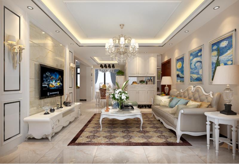 這是一套119平米三居室的裝修案例效果圖,風格是現(xiàn)代美式??蛷d采用明亮的淺色瓷磚進行鋪設,配以同色系的皮質(zhì)沙發(fā),面積不大,但是看起來十分寬闊明亮。背景墻用世界著名油畫《星月夜》,彰顯品位。