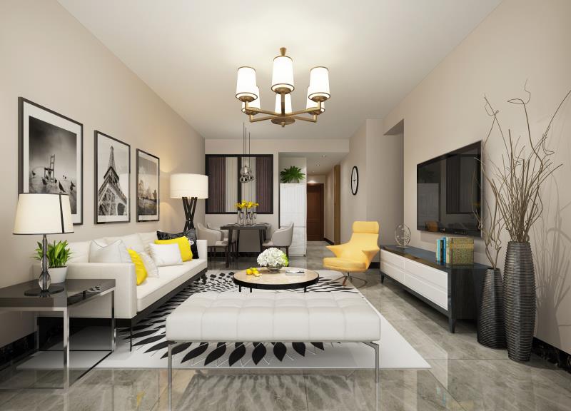 客廳的設(shè)計很有巧思,因為戶型的限制,所以并沒有給天花板安裝吊頂,只需要一盞簡單的吊燈,就足以讓整個客廳變得明亮。如果只是簡單的黑與白,就會顯得比較單調(diào),所以設(shè)計師用一些明亮的色彩做點綴,時尚感十足。