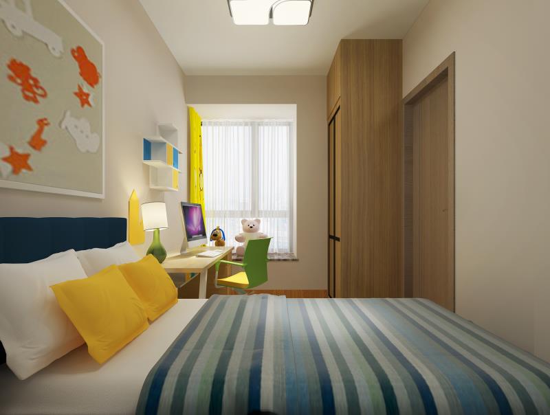 兒童房的面積比較小,所以只是簡單地擺進了一個衣柜、一張書桌和一張床,為了增加儲物面積,設(shè)計師在書桌上方還設(shè)計了造型獨特的置物架,可以用來放一些書籍或者一些工藝品。