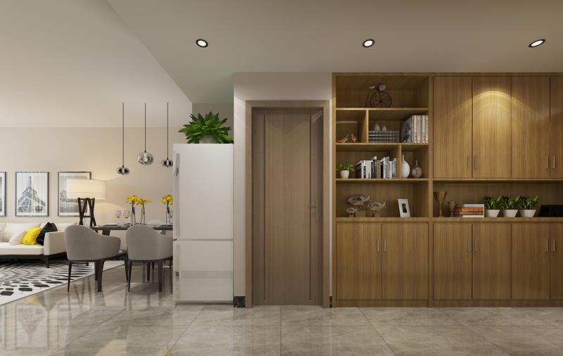 客廳和廚房之間的連接處,還有一大片空間可以利用。定制的一體式柜子滿滿當當?shù)卣紦?jù)了整面墻,不浪費任何一分空間。而且柜體分為密閉的儲物區(qū)和開放的展示區(qū),滿足多種需求,實用性很強。